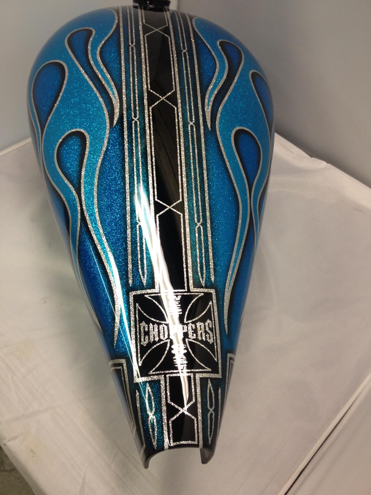 We work with two local painters, each known for their stunning work. Flames, Skulls, Murals, Marblizing, Fishnet, Flake, Candy, Pearls, Ghosting, New School, Old School, Air Brush, Goldleaf...if you can dream it up, our guys can bring it to life in paint.