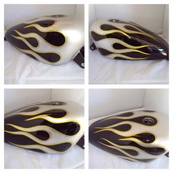 If you are looking for a custom motorcycle paint job your at the right place! Custom motorcycle paint for any make or model motorcycle on your existing motorcycle parts. Repair and refinishing of OEM paint also available.